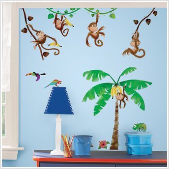 , It's time to get down to business-monkey business, that is! These cute monkeys are the perfect addition to a jungle-themed bedroom or kid's play area. Application is easy: just peel each pre-cut sticker from the liner, then smooth it on the wall. But our decals aren't only for walls! Try using them on doors, furniture, mirrors, windows, or any other smooth, flat surface. You'll love the fun and character they bring to any room. This product is printed on clear material. White or light colored walls are recommended for best results. ...